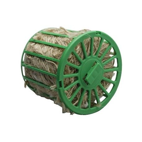 Nest houder of korfje gevuld met sisal fibre gemengd. Het kan tussen de tralies van de kooien bevestigd worden. Eenmaal op kan men het bijvullen met materiaal naar keuze.