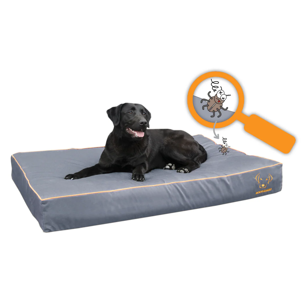 Waar de bovenkant en de zijkanten van dit kussen uw hond een optimale bescherming bieden door de speciaal geïmpregneerde INSECT BODYGUARD, is de onderzijde voorzien van een speciale antislip. Wanneer uw hond op het kussen gaat liggen zullen de teken, vlooien, mijten, muggen, etc. die in contact komen met het kussen gedood worden. |