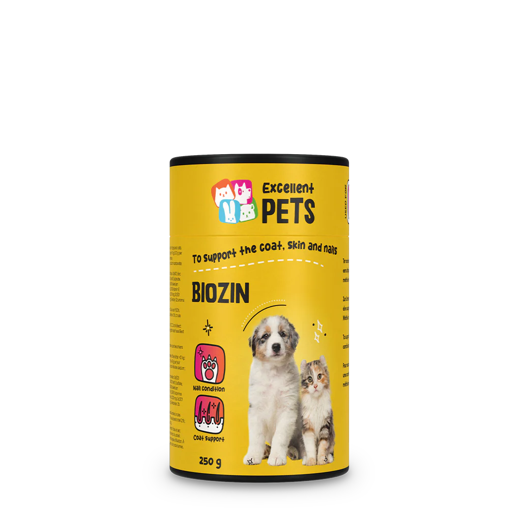 Excellent Pets Biozin is een aanvullend diervoeder voor honden en katten in poedervorm. Het ondersteunt de vacht, de huid en de nagels.